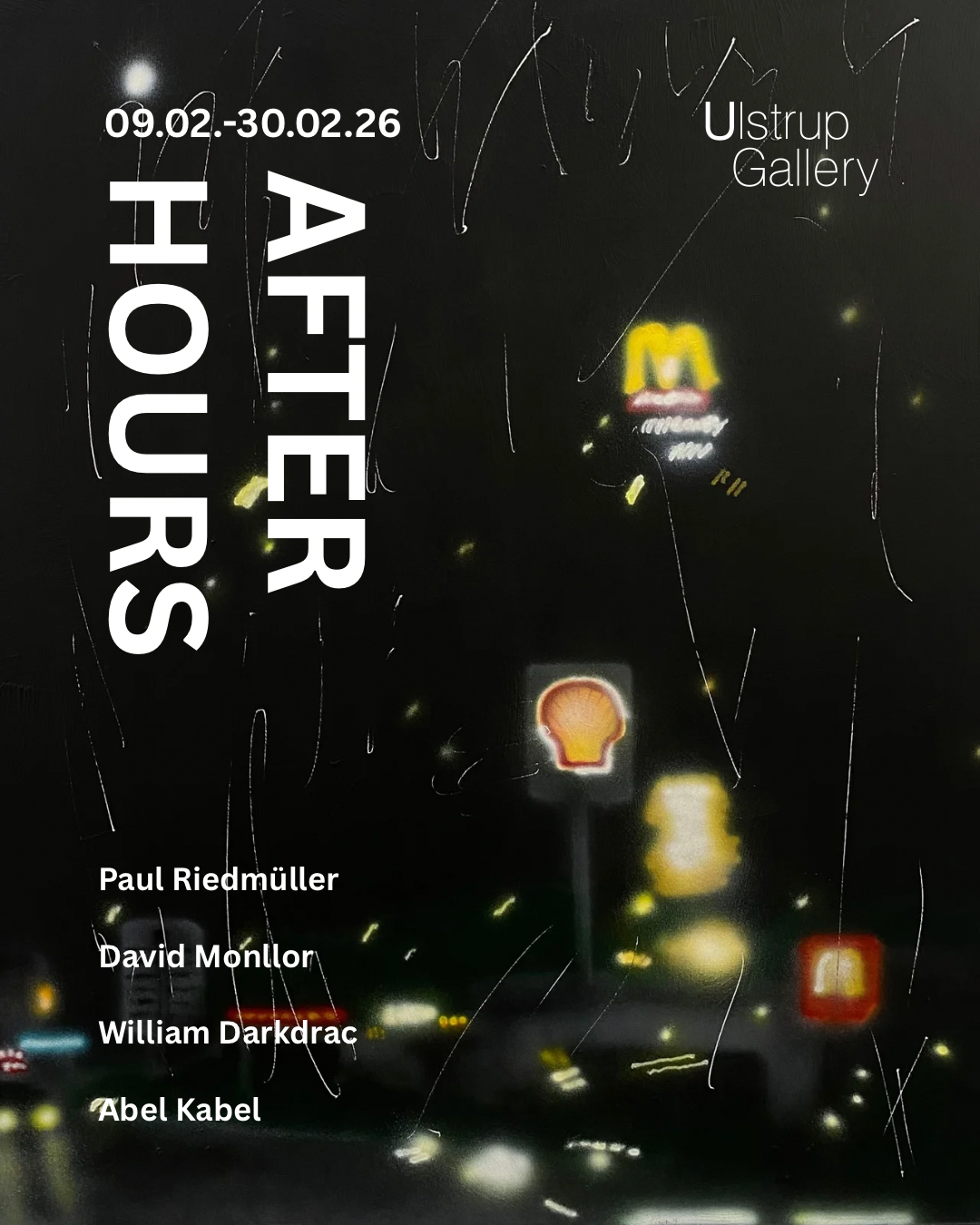 In the upcoming online group show AFTER HOURS, artists Paul Riedmüller, David Monllor, William Darkdrac, and Abel Kabel examine the psychological, social, and spatial conditions of the night as a contemporary state of being. The works presented explore nocturnal environments not merely as settings, but as states where isolation and intimacy intersect. Only artificial light cuts through the darkness of AFTER HOURS. An office with an empty chair contrasts moments of intimacy and social release: bodies in proximity, figures drinking and celebrating, suspended in the temporary freedom that night affords. These scenes oscillate between connection and excess, intimacy and escapism.